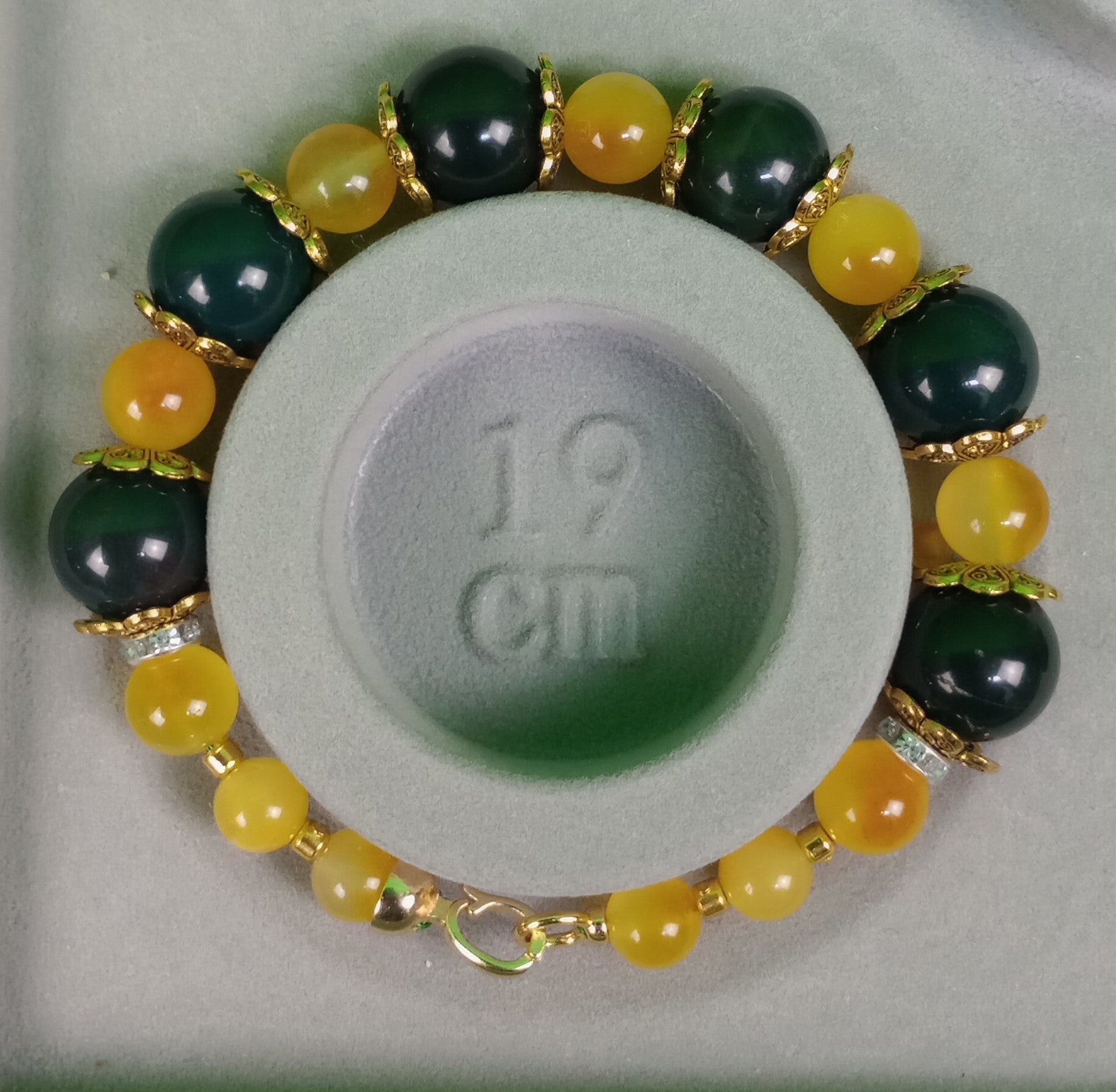 Handarbeit. Wunderschöne Armband aus Sonnenuntergang -gelber Chalcedon und dunkel grüne Moostor Stein-Perlen. Größe 19 cm.